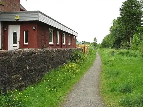 The station was opened on 26 May 1856 by the Forth and Clyde Junction Railway. The station building was on the eastbound platform and the goods yard was served from the east. The station closed on 1 October 1934.[1] The nearby signal box was reduced to a signal box after closure. The station building and the goods shed survives today.