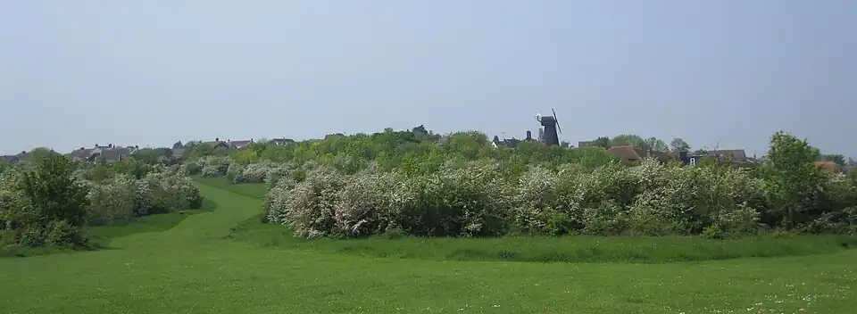 A view across part of the downs to the windmill and showing the mass of hawthorn in bloom