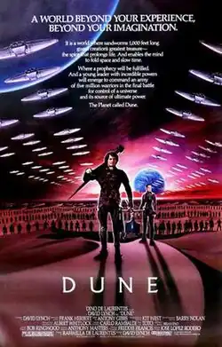 The film opened on December 14, 1984, in 915 theaters, and grossed US$6,025,091 in its opening weekend, ranking number two in the US box office behind Beverly Hills Cop.[36] By the end of its run, Dune had grossed $30,925,690 (equivalent to $94,000,000 in 2024).[2] It earned theatrical rentals of $37.9 million worldwide.[3] On an estimated production budget of $40–42 million, the film was considered a box-office disappointment.[37] The film later had more success, and has been called the "Heaven's Gate of science fiction".[38]