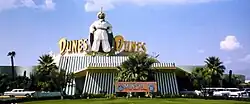 Lee Klay of the Federal Sign and Signal Company designed a roadside sign for the Dunes,[237][242] activated on November 12, 1964.[243] Klay recalled that the resort owners asked him to create "a big phallic symbol going up in the sky as far as you can make it".[242] At 181 feet (55 meters),[237] it was the tallest free-standing sign in the world.[71] The foundation measured 80 feet in width,[71][239] and supported two white-colored columns forming a bulbous onion dome or stylized spade shape at the top. Contained within this shape were two-story-high letters spelling out "Dunes", with a large diamond atop the lettering.[237][242]