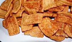 Duros may be microwaved, but the best results are achieved when they are deep fried.[2] Ready-to-make duros are often sold in supermarkets, and simply require being fried in oil.[3] They are typically seen served by street vendors in a plastic bag and topped with salsa and chili, lime, salt, or with hot sauce and lemon juice that is sprayed into the bag, then finished with chili powder.[4]