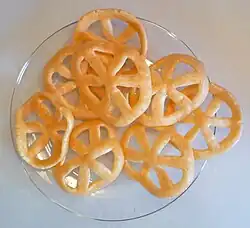 Duros de harina (also known as pasta para duros, duritos, durros, pasta para durito, chicharrones, churritos, Mexican wagon wheels or pin wheels) are a popular Mexican snack food made of puffed wheat, often flavored with chili and lemon.[1]