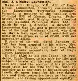 John Dingley (1829-1885) bought Eagle House soon after his marriage to Charlotte Shum in 1857. He was born in 1829 in Launceston. His father was Richard Dingley, who was an agent of Tavistock Bank and had served as Mayor of Launceston.[23] In 1855 - together with his father, Edward Pethybridge and George White - John formed the Launceston Bank. This bank eventually became part of NatWest.[24]
