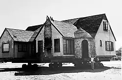 Moving the Young-Sartorette House in 1981 with Joanna Herz at front door.