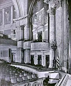 At the time of construction in 1923, the theatre was the costliest theatre ever constructed in Philadelphia.[3] The opulent grand theatre in the Italian renaissance style contained 2768 seats, of which 1164 seats were on the balcony.[9] The stage measured 62 feet by 35 feet.[3] George Matthews Harding painted the extravagant murals and friezes, and marble was imported from Italy.[9]