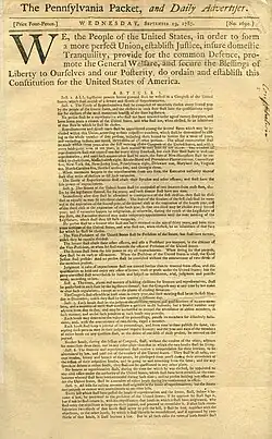 In 1787, Dunlap was commissioned to make printed copies of the Constitution of the United States, on September 19, 1787, for review at the Constitutional Convention, and later published it for public review for the first time in The Pennsylvania Packet.[190][q] On April 30, 1789, George Washington took the oath of office as the first President of the United States in Federal Hall in New York City. After the swearing in ceremony Washington entered the Senate chamber and delivered the first presidential inaugural address. The entire event and speech was covered in an eyewitness report on May 6, 1789, in the Massachusetts Centinel.[191] Towards the end of President Washington's second term he decided it was time to resign and declined offers to run for a third term. With the help of James Madison and Alexander Hamilton, Washington, now at the age of sixty-four, wrote his Farewell Address. He never read the Address publicly but had it published in newspapers in Philadelphia, which at the time was the capital of the United States. The Pennsylvania Packet and American Daily Advertiser was the first newspaper to carry the address in its issue of September 19, 1796. Before long the now famous Farewell Address was widely circulated and reprinted in many newspapers, including the New York Herald on September 21, 1796.[191][190]
