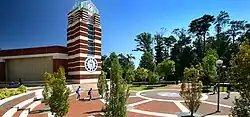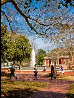 The main campus, also known as the east campus, is about 530 acres (2 km2) in an urban residential area of downtown Greenville. The 158 buildings on main campus comprise more than 4.6 million square feet (430,000 m2) of academic, research, and residential space.[8] Many of the Main Campus buildings feature the Spanish–Mission style architecture; inspiration drawn from Thomas Jarvis' time as an ambassador to Brazil.[19][20] He wanted to bring the unique architecture to eastern North Carolina. On the main campus, there are five districts: Campus Core, Downtown District, Warehouse District, Athletic fields and the South Academic District. On the Campus Core, there are 15 residence halls which are divided into three separate neighborhoods.[21] In the middle of the mall is the replica of the cupola on the original Austin building.