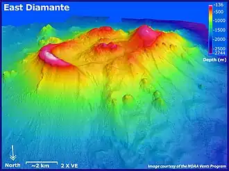 The summit of East Diamante lies 127 m (417 ft) below sea level and is truncated by an elongated, northeast–southwest-trending caldera. Formation of the caldera was followed by the emplacement of a central dome complex and the construction of a volcanic cone on the southwest caldera rim. The central dome complex displays hydrothermal activity, including black smokers.[1]