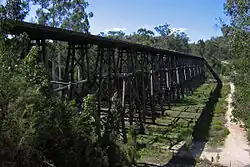 The East Gippsland Rail Trail itself continues east through the Colquhoun State Forest on a generally good surface at a gradual decline. A few kilometres on from the Discovery Trail turnoff is the site of the former Colquhoun railway station and siding, which, at 129m is the highest point on the trail, however the site is rapidly being overgrown by forest.[2][5] Further along, about 4.5 km west of Nowa Nowa is the spectacular Stony Creek Trestle Bridge, built in the early 1900s and measuring 276m long and 19m high. Due to its poor condition the bridge itself is fenced off, and trail users must travel down and up the steep slopes of the Stony Creek valley to reach the far side. A car park, toilet and picnic facilities are available at this location.[5]