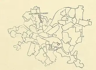 East Street Valley was a neighborhood on Pittsburgh's North Side that stretched northward along the historic path of Butcher's Run, once home to residences, shops, industries, and civic and religious institutions. The neighborhood was demolished prior to the construction of Parkway North, causing the displacement of hundreds of residents over several decades.