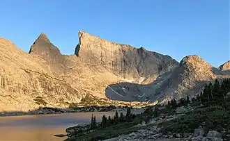 East Temple Peak (exact height range is somewhere between 12,605 to 12,645 feet (3,842 to 3,854 m)[1]) is located in the southern Wind River Range in the U.S. state of Wyoming. East Temple Peak is a little over 1 mile (1.6 km) northeast of Temple Peak and 1.5 mi (2.4 km) west of Wind River Peak.[3] A small glacier clings to the northeast slopes of East Temple Peak. East Temple Peak is in the Bridger Wilderness of Bridger-Teton National Forest.