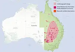 The conservation status of the species is Least Concern (IUCN) as of 2017. There is limited loss of habitat largely due to agricultural practices, especially from cotton crops; however, these are not expected to cause significant decline.[9] The population trend is stable, although there is a decline of mature individuals. Populations are severely fragmented and have extreme fluctuations in area occupied.[9]