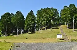 The Ebisuyama Kofun is a zenpō-kōen-fun (前方後円墳), which is shaped like a keyhole, having one square end and one circular end, when viewed from above. It is located in the Noda River basin in the Tango Peninsula, and is orientated to the northwest. The tumulus has an overall length of 170 meters, and is the largest of a group of eight tumuli in this vicinity. It is estimated to have been constructed in the middle of the Kofun period, or the early 4th century. The tumulus was constructed in three tiers, and had both fukiishi, and cylindrical and figurative haniwa. After damage due to the 1927 North Tango earthquake, the tumulus was excavated and three burial facilities have been found in the center of the posterior circular portion, of which one contained a boat-shaped sarcophagus with elaborate carvings. Grave goods included bronze mirrors and iron swords and spearheads. The sarcophagus was designated a Kyoto Prefecture Tangible Cultural Property in 2019.[2] Currently, the site, together with the Tsukuriyama Kofun, is open to the public as the Yosano Municipal Kofun Park.[2]