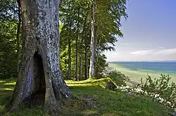 The shores of the bay are shaped by the tides and the surf as during high winds from the northeast and southwest, heavy sea might build up. When the water level is 0.75 m (2.5 ft) higher than usual, sand and gravel is being eroded from the cliff coast. In some places, the coastline recedes 15 to 20 cm (5.9 to 7.9 in) every year. As a result, the hills of the Terminal moraines, that had formed during the last Ice Age in the southeast are hollowed out and a 30 m (98 ft) high and 3.6 km (2.2 mi) long cliff has formed in front of Altenhof. The steadily eroded material is partly deposited further west and has separated the Goossee from the Eckernförde Bay. Several sand banks run parallel to the beach. The banks are mainly forested with deciduous trees.[2][3]