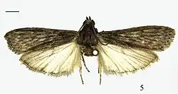 The wingspan is 25−30 mm. The forewings are dark greyish brown with some white powdering and black along the veins. The antemedial line is invisible, and the discal spots are blackish brown and separated. The postmedial line is faint, greyish white, and serrated, gently curved inwardly from the costal one-fifth to the dorsum at one-fifth. The terminal line is black and interrupted. The hindwings are greyish white, and light brown along the costa and veins.