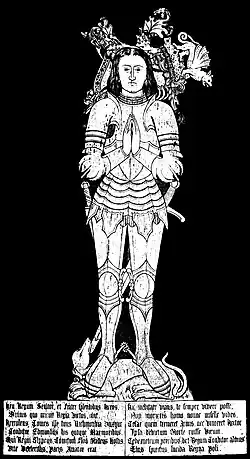 As Herbert's troops moved on to Aberystwyth,[13] Edmund was left behind, imprisoned in Carmarthen Castle. On 3 November 1456, Edmund became infected with the bubonic plague and died there. He was buried at the nearby Franciscan Church in Carmarthen. There were suspicions that Edmund may have been murdered, and so a trial was held several months later with several parties accused, but no one was found guilty. Edmund's remains were removed to the choir of St David's Cathedral, Pembrokeshire, in 1539, due to the dissolution of the monasteries enacted by his grandson, King Henry VIII of England of the Royal House of Tudor.[14]