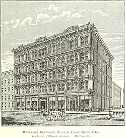 The firm began in 1872, when several former employees and partners of Allan Sheldon & Company (formerly Town & Sheldon) elected to form their own firm under the name Edson, Moore & Co. Those men were James L. Edson, George F. Moore, Ransom Gillis, Charles Buncher and Stephen Baldwin. Both Edson and Moore had been partners in the Allan Sheldon & Company firm. The new firm, Edson Moore, originally occupied the addresses of 190-192 Jefferson Avenue in Detroit.[3][4] They quickly established themselves as one of the largest dry goods and wholesale businesses in Michigan[5] occupying a larger store front on Jefferson Avenue from 194 through 204 in a building built expressly for their needs.