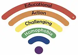 Educational Action Challenging Homophobia (EACH) is a charity based in the United Kingdom which "affirms the lives of lesbian, gay, bisexual and trans (LGBTQ) people and reduces discrimination experienced because of sexual orientation or gender identity."[3] Since 2003, EACH has delivered training and consultancy services on sexuality and gender identity matters across the statutory, voluntary and private sectors. It also provides support to those affected by homophobic, biphobic or transphobic bullying through its nationwide, freephone helpline.[4]