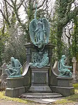 Spruce first worked at a local tile factory before moving to Burmantofts Pottery in Leeds, where he was the principal modeller.[5] His work there includes some fine panels on the Midland Hotel, Manchester.[5] He went to Paris to study art and exhibited a piece called "The Blind Man" at the 1908 Salon.[6] He returned to Leeds to set up as a freelance artist with a studio in Chapeltown, Leeds.[4] In this he was successful, performing numerous portrait commissions of contemporarary figures including a bust of the Lord Mayor of Leeds, Sir James Kitson.[4][7] Between 1906 and 1915 he exhibited at least four works at the Royal Academy in London.[3] He also created the panels for the war memorial at Bailiff Bridge in West Yorkshire.[3] Possibly Spruce's best known work is the 1918 large multi-figure memorial to the Leeds businessman Sam Wilson at Lawnswood Cemetery in Leeds. The monument is recognised by Historic England with a Grade II listing.[8]