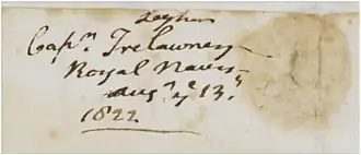Trelawny was initially happy to have joined the navy and enjoyed the rough lifestyle there.[22][23] He often exaggerated his age while he was in the navy. Some biographers believe he commanded a vessel as a midshipman in an engagement with the French at Mauritius in 1810.[24] Some also believe that he was wounded engaging the French in Java in August 1811. He left the Navy in 1812 at the age of 19; receiving a final settlement of pay in 1815.[25] He had grown to resent the discipline of the Navy due in part to the frequent punishment that he experienced. He was often sent to the masthead for several hours at a time.[26] During that time, he frequently entertained fantasies of mutiny and desertion.[27] Some biographers believe that Trelawny was inspired by hearing accounts of the French pirate Robert Surcouf.[28] He was never commissioned as a lieutenant, though many of his contemporaries were.[29] This disappointed him, although he began referring to himself as Lieutenant Trelawny anyway.[30]
