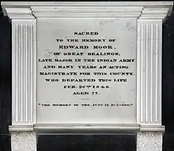 He retired to Bealings House, Great Bealings, Suffolk in 1806. His son, Canon Edward James Moor (1800โ€“1866) was Rector of Great Bealings from 1844 to 1886.[3]