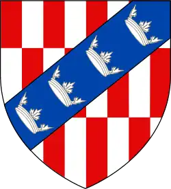 Paly of eight Gules and Argent a fess counterchanged, overall on a bend sinister Azure four coronets erablé Argent.