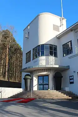 The Functionalist building was first completed in 1929, drawn by architect Lars Backer. The restaurant has flat roofs, large windows, a terrace and an arched entrance in a corner tower. The architect maximized the number of window seats.[1]