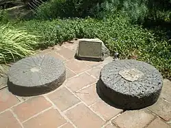 When Mrs. Brehm died in 1962, the Old Mill was willed to the City of San Marino.[8] The city has preserved the building and opened it to the public as a museum and art gallery (California Art Club Gallery), operated first by the California Historical Society and later by the Old Mill Foundation. The museum is open Tuesday through Sunday from 1 p.m. to 4 p.m. A model showing how the mill operated is located on the ground floor of the museum. While nothing remains of the waterwheel, two of the millstones (pictured above) are displayed in the garden area. The millstones were found more than a century after the mill closed on the grounds of the Huntington Library by General George S. Patton, who grew up in the area and recalled seeing them used as blocks for mounting horses.[2][7] There is also a 16th-century volcanic rock fountain in the patio to the east of the mill. The fountain was acquired in Mexico by Mrs. Brehm's daughter, Mrs. Albert Doerr.[13]