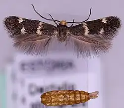 The wingspan is 10–11 millimetres (0.39–0.43 in). The moth flies from June to August depending on the location.[1] The head is light ochreous-yellow, seldom with a fuscous spot. Forewings are dark fuscous; a somewhat oblique fascia before middle, a small tornal spot, and another on costa beyond it ochreous-whitish, in female enlarged and more conspicuous. Hindwings are blackish grey. The larva is pale yellow; head pale brown.[2][3][4]