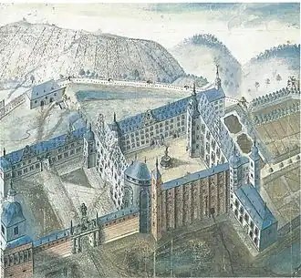 The palace around 1745, before the south wing reconstruction. The west wall and apse of the Basilica remain. On the left the Niederschloss; on the right the Hochschloss