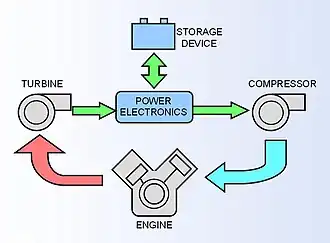 A turbocharger that can divert some of the exhaust gas to produce electricity (using the vehicle's alternator) is sometimes called a hybrid turbocharger.[14]