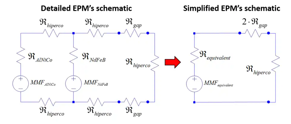 Detailed and simplified schematic of the EPM's magnetic circuit.