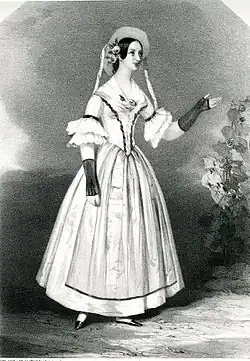 She first sang in public at the vocal concerts, 29 February 1836, when she sang an aria from Der Freischütz. Her success was so pronounced as to lead to an immediate engagement for the succeeding concert in March. On 27 October in the same year Miss Rainforth made her stage début as Mandane in Thomas Arne's Artaxerxes at the St James's Theatre, and for many seasons she was a popular dramatic singer at this theatre, the English Opera House, Covent Garden, and Drury Lane. At the same time her services as a concert-singer were in great demand. In 1837 she appeared in oratorio under the auspices of the Sacred Harmonic Society[3] and in 1838 she was pictured in Bickerstaffe and Arne's Love in a Village in 1838.[1] On 18 March 1839 she sang at the Philharmonic concerts; and in 1840 at the Concerts of Ancient Music. In 1836 and 1842 she was a principal singer at the Norwich Festival. In 1843 and 1845 her success at the Birmingham Festival and at the Worcester festival was no less emphatic; in 1844 she was performing in Dublin. On 27 November 1843 she created the role of Arline in Balfe's The Bohemian Girl.[3]