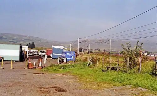 Trains pass at speed on the electrified West Coast Main Line. Also at this location is a feeder station from the National Grid. Very few remnants of the station are still visible on the site.