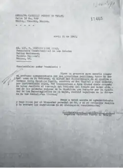 Carrillo was employed as a statistician at the Secretariat of Economy, but was terminated from her position in January 1938. Meanwhile, her son was also dismissed from his position as a stamp inspector in Sonora.[59] That February, President Lázaro Cárdenas proposed that the women of the FUPDM be integrated into the newly renamed Party of the Mexican Revolution (Spanish: Partido de la Revolución Mexicana, PRM, formerly the PNR) as a "vital sector". Carrillo signed a document agreeing to this proposal in her capacity as the secretary of the Women's Revolutionary Institute.[60] This led to the fragmentation of the FUPDM into smaller interest groups for workers, peasants, the military, and other sectors. Some FUPDM members criticized the move, with Adelina Zendejas arguing that "the way to control women was to incorporate them into each sector", with women's leaders advocating "only for those in their little chapel".[61]