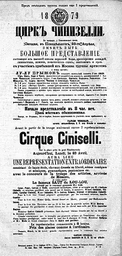 In the summer of 1879, the Madigan family tried to run their own small circus company in Finland and at the same time Hedvig began using the name Elvira Madigan.[6] The following year, when the family appeared in Circus Cremes in Vienna, Gisela Brož became a foster child in the family, she was two years older than Elvira. Gisela was trained as a tightrope dancer, and together with Elvira on slack line they practiced a unique number, where they appeared simultaneously on separate lines, one above the other. Elvira used to juggle at the same time as she was on the line. The number became a sensation, and in the following years the girls appeared as "daughters of the air" in circuses and in variety rooms across much of Europe, including in Berlin, Paris, London, Brussels and Moscow.[7] After an appearance at Tivoli Gardens in Copenhagen in 1886 before the Danish royal family, the girls were each awarded a gold cross by King Christian IX of Denmark.[8] The following year, John Madigan again started his own circus company, this time in Denmark. Gisela left the family in the autumn of the same year, after which Elvira had to appear alone when the tour continued to Sweden.