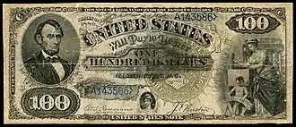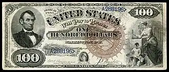 Ninger began counterfeiting in 1878,[2] and by 1879 the Treasury redemption bureau was aware of his work.[5] Not having any clues as to Ninger's identity, he was named "Jim the Penman" by the Secret Service.[6] Beginning with a $10 bill, he moved on to $20s and $50s, and later $100s.[2] His first $100 was spotted by the Treasury in November 1893.[5] Ninger would buy bond paper from Crane & Company, in Dalton, Massachusetts, cut it to the same size as the $50 and $100 United States Notes he was copying, then soak the paper in a dilute coffee solution. He would align the paper over a genuine banknote, place the two on a piece of glass, and trace the resulting image.[3][7] He used a camel’s hair brush to put colors on the note, imitated the silk threads with red and blue inks, and suggested rather than duplicated the intricate geometric lathework.[3][7] Notably, he omitted the line crediting the Bureau of Engraving and Printing from all of his bills,[3][7] and some of them were also missing the counterfeiting warning.[7] When asked why he omitted the Bureau of Engraving and Printing credit on his bills, Ninger responded, "Because dey [sic] didn't make dem [sic]."[8]