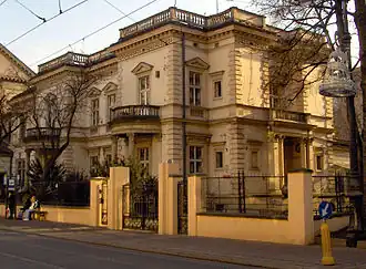 Count Emeryk Hutten-Czapski (born 17 October 1828 in Stankow near Minsk, died 23 July 1896 in Kraków) was a Vice-Governor of St Petersburg and an important collector of books, prints, and numismatics. He built his collection at his family estate in Stankow, today in Belarus. Fearing for the safety of the collection, being close to Russia, he moved the collection to Cracow. In 1894, he purchased a 19th-century palace, on what is today 12 Pilsudski Street, and built an addition to house his collection.[2] He personally catalogued the collection. He died in 1896, before the addition was finished. His wife, Baroness Elzbieta Meyendorff, completed the construction of the addition, and in 1904, as per her husband's request, donated the collection to the city of Cracow. The museum displays the Czapski crest on the outside, along with the inscription on the pediment: "Monumentis Patriae Naufragio Ereptis" (Patriotic Monuments Saved from the Destruction of the Storm).[3]