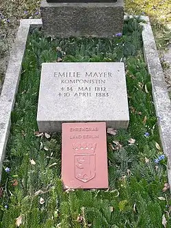 In 1876, Mayer returned to Berlin where her music was still frequently performed. Mayer’s new Faust Overture, based on Goethe's Faust, was successful and she re-established herself as a significant figure in the city’s cultural circles.[10] She was a honorary member of the Philharmonic Society in Munich and was the co-chair of the Berlin Opera Academy. Mayer died on 10 April 1883 from pneumonia[6] in Berlin and was buried at the Dreifaltigkeitsfriedhof I at the Holy Trinity Church not far from Felix and Fanny Mendelssohn.[11]