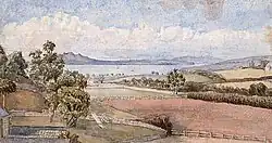 Rangitoto as painted by Emma (then named Buchanan), circa 1857. Original in the Auckland Art Gallery.