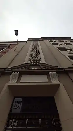 The facade is fragmented into the three classic bands. The one-story plinth is entirely associated with cinematographic and theatrical use. The three main sides are topped with awnings to protect the public gathered on the street. The central strip is composed vertically, arranging the openings in several series of columns, one for each identifiable area of the elevations. The stairwells are illuminated by a slit opening, veiled by a lattice molded in situ, which accentuates the verticality, while providing a rhythmic counterpoint to the uniform generality. In the lower section, the cornice is formed by the roof skirt, finished in slate, in neo-Herrerian fashion, and by dormers that establish a reference with the composition of openings in the lower face.[4]
