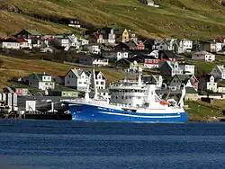 Oil consumption peaked at over 300,000 tonnes in 2020, at a value of DKK 1 billion.[81] Of this, 30% was for fishing vessels.[82] In 2014, 217,547 tonnes of oil products were consumed in the Faroe Islands.[83] Of these, 31.58% was consumed by fishing vessels, 14.73% was used by SEV for electricity production, 23.23% was consumed in air, sea or land transport, 9.6% was used in the industry, and the rest was used by public or private buildings.[84]