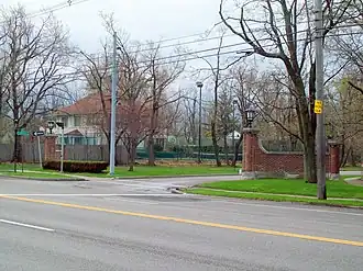 Entranceway at Main Street at LeBrun Road is a suburban residential subdivision entranceway in Amherst, New York, USA. It was built about 1920 by Goode & Sickels, Realtors. It is located on Main Street (New York State Route 5) at Eggertsville in the town of Amherst within Erie County. It consists of half-height brick masonry walls, brick masonry posts, and accent light fixtures located on either street corner.[2]