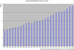 Air transport in the United Kingdom is a growth industry. In the period 1981 to 2006 the number of terminal passengers increased by 400 per cent and air transport movements by 250 per cent.[1][2] Although the transport of freight declined slightly year on year between 2004 and 2006, in the decade since 1996 air freight has increased by 31 per cent.[3] During the period in which government policy was being formulated the number of passengers exceeded 200 million, and in 2006 the industry handled over 236 million passengers (up 3 per cent from the previous year), with nearly 2.4 million air transport movements (up 1.8 per cent).[2][4][5]