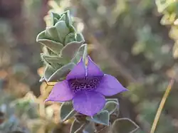 Eremophila mackinlayi, commonly known as desert pride,[2] is a flowering plant in the figwort family, Scrophulariaceae and is endemic to Western Australia. It is a shrub with its branches and leaves covered with a thick layer of yellow to grey hairs, mostly egg-shaped leaves and deep lilac-coloured to purple flowers. It is most closely related to E. strongylophylla and E. hygrophana and sometimes occurs in the same areas as these species.