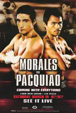 Erik Morales vs. Manny Pacquiao, billed as Coming With Everything, was a super featherweight boxing match.[1] This match occurred on March 19, 2005, at the MGM Grand Garden Arena, Las Vegas, Nevada, United States and was distributed by HBO PPV.[2][3] The bout is the first of the Pacquiao-Morales trilogy,[4] widely considered one of the greatest boxing trilogies of all time.[5][6][7]