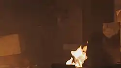 Inside scenes of the storyline took a day to film, with the "sense of concentration on the set" being described as "really intense".[9] Outside scenes were filmed a week prior.[10] The make-up department padded down the actors with fake smoke before their scenes.[4] Scenes set in school corridors were shot in old Network 10 tunnels, where Prisoner was filmed, which gave Mann "flashbacks".[1] Various boom operators were used to capture audio,[2] while smoke and fire machines were incorporated for realism.[1] Mann recalled director Tony Osicka being very cautious of her asthma during the filming. All smoke machines used vapour instead of real smoke, which allowed Mann to not be affected, however made it so Mann had to pretend she could "see it all". During Mann's filming, the set was "flame-free and smoke-free" for most of the time and Mann said that doing stunts "was really fun to do" as big events on Neighbours do not occur often.[1] She admitted to constantly asking the producers on how to act and she said of her acting, "I'd like to say it was real but it wasn't."[1] Morey revealed that the cast was only given access to the special effects behind the camera at certain times.[3] She said the set looked like an actual fire and said that it felt as though it were a movie set. She added of it, "It was also nice to be working on a different set, rather than just filming in our kitchen at home or the coffee shop."[3] A scene involving an explosion that knocks out Terese and Lauren did not include any special effects and was all done in studio.[11]