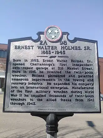 Ernest W. Holmes Sr. (January 17, 1883– June 10, 1945) was born in Hobbs Island, Alabama.[1] He became the inventor of the first tow truck when he fastened various parts to his 1913 Cadillac.[2] He then founded Ernest Holmes Co, which still spiritually lives on through Miller Industries. He later would also serve a term as a member of the Electric Power Board of Chattanooga and the American Society of Automotive Engineers .[1]