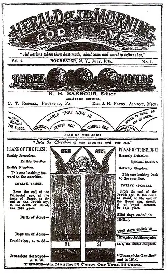 The selection of 1878 as the year of the rapture of the saints was based on the application of parallel dispensations, which equated the 3½-year period of Christ's ministry with a similar "harvest" period following his parousia. When the rapture failed to occur, Russell admitted they "felt somewhat disappointed", but decided there would be an additional 3½-year period "making the harvest seven years long".[67] Successive issues of The Herald of the Morning identified the autumn of 1881 as the end of the "Harvest" and the likely time for the translation of the Church to heaven.[68][69][70] Russell split from Barbour over doctrinal differences and began publishing Zion's Watch Tower in July 1879.