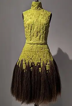 When McQueen and Leane participated in the Fashion in Motion series at the Victoria and Albert Museum (V&A) in 2001, they included accessories from Eshu as part of their presentation.[84] Four items from Eshu appeared in the 2011 exhibition Alexander McQueen: Savage Beauty, originally at the Metropolitan Museum of Art: Look 7, the dress of beige leather with metal wire crinoline; Look 8, the nude synthetic dress with mud and wooden beads; Look 37, the dress of yellow glass beads and black horsehair; and Look 58, the coat of black synthetic hair.[85] These were placed in the Romantic Primitivism section of the exhibit.[85] Five accessories from the collection appeared in the Cabinet of Curiosities section: a silver-plated resin neckpiece, craftsperson unspecified, and four pieces of jewellery in silver by Shaun Leane – a nose bar, a tusk mouthpiece, a pair of hooped earrings, and a set of coiled neck rings.[86] The exhibition Lee Alexander McQueen: Mind, Mythos, Muse, originally staged in 2022, featured a copy of Look 11 – the dress printed with the Wanda Wulz photograph – owned by the Los Angeles County Museum of Art.[87]